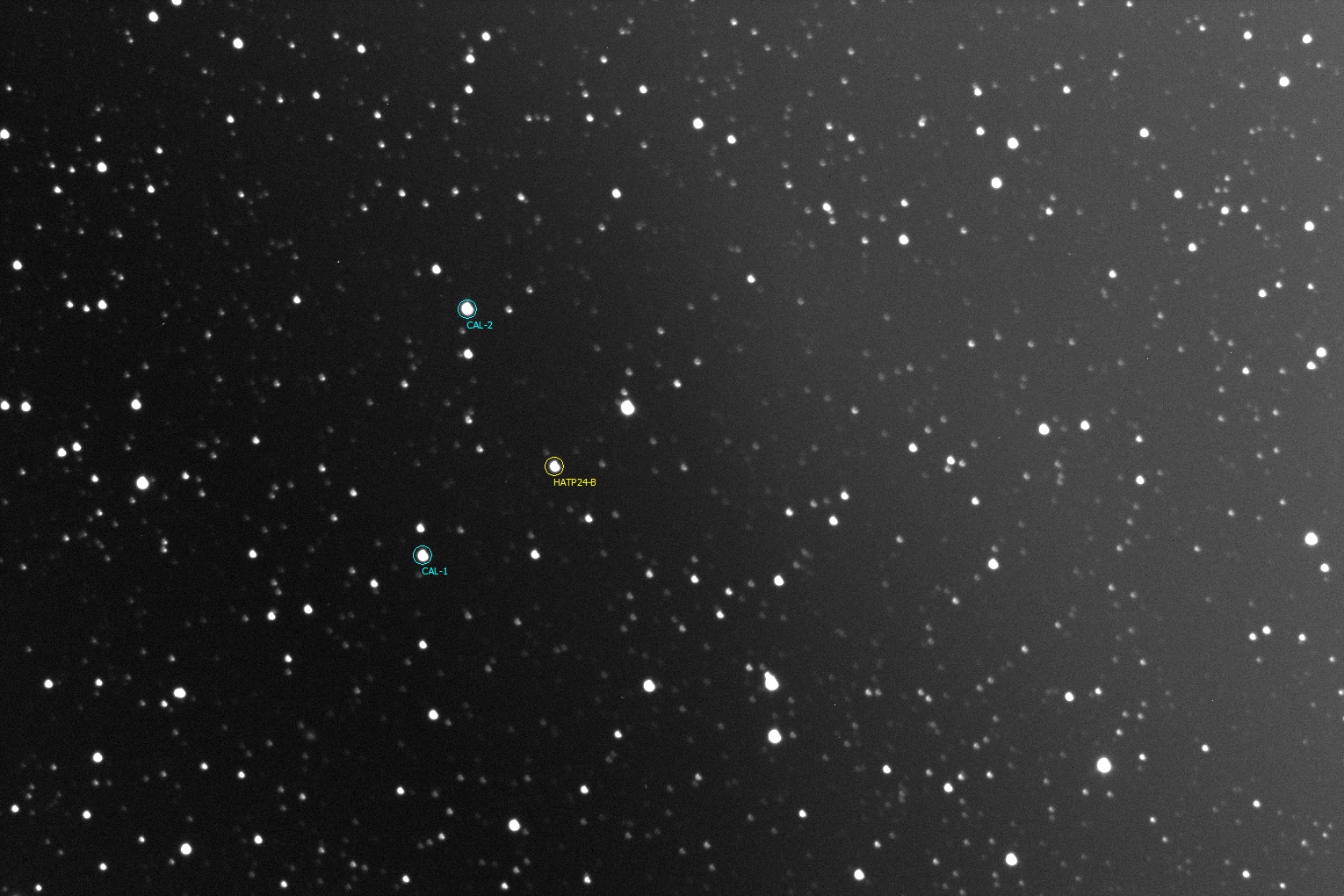 Observación del tránsito del exoplaneta HAT-P-24b, en la constelación de Geminis, realizada la pasada noche. Es un plantea de tipo Júpiter caliente que completa una órbita en tan sólo tres días. Este sistema solar se encuentra a casi 1.000 años luz de distancia.