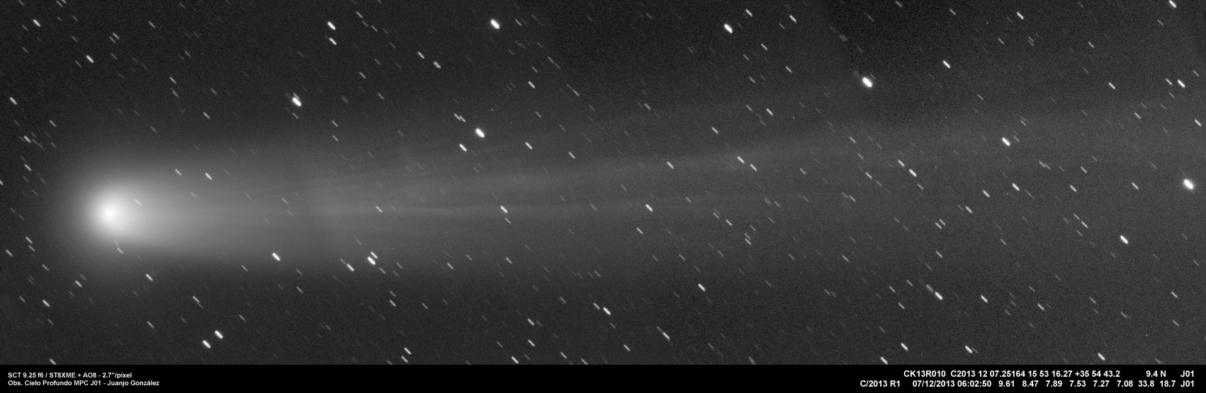 Cometa C/2013 R1 Lovejoy 7 diciembre 2013 • Juanjo Gonzalez Impresionante aspecto del cometa Lovejoy esta mañana. Mosaico de cuatro imágenes formada por 10 tomas de 30″ cada una. Comparte esto: Haz clic para compartir en Facebook (Se abre en una ventana nueva) Facebook Haz clic para compartir en X (Se abre en una ventana nueva) X Me gusta Cargando... Relacionado