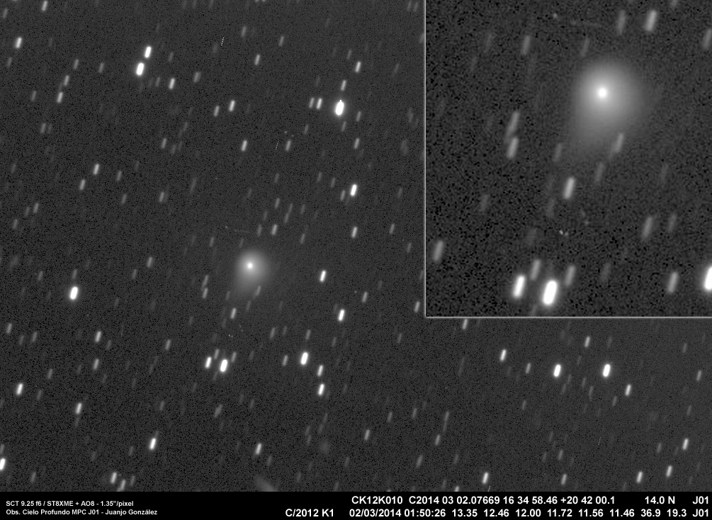 La racha de mal tiempo continua, lo que limita mucho las observaciones. En un momento despejado he podido capturar esta imagen del cometa C/2012 K1, que continua acercándose a su perihelio (previsto para finales de Agosto). Parece haber desarrollado una coma gaseosa y una incipiente cola. Su distancia a la Tierra es de unos 370 millones de km.