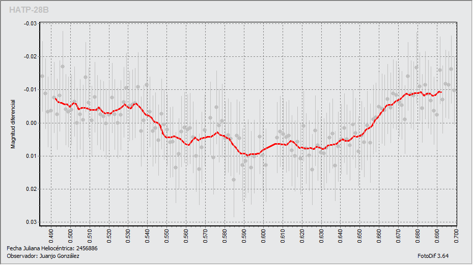 Observación realizada la pasada noche del tránsito del exoplaneta HAT-P-28 b en Andromeda. El sistema planetario esta situado a 1288 años luz. EL planeta observado completa una órbita en unos 3.26 días terrestres, y tiene una masa equivalente a 0.6 veces la de Júpiter, a pesar de tener un volumen mayor que éste, por lo que se trata de un planeta gaseoso con una baja densidad.