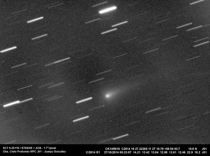 Imágenes de los dos cometas Borisov, C/2014 R1 y C/2014 Q3. El C/2014 R1 se encuentra a menos de un mes de su perihelio, situado ahora mismo a unos 280 millones de km. de distancia de nosotros. Se trata de un cometa de largo periodo, que volverá a visitarnos dentro de unos 193 años. Es interesante seguir su evolución las próximas semanas.