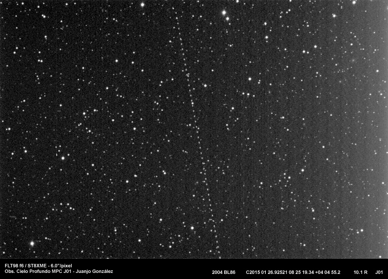 Animación obtenida hace sólo unos minutos del paso del asteroide 2004 BL86. Este asteroide, de entre 500 m. y 1 km. de diámetro esta en estos momentos a tan sólo unos 1.3 millones de km. de distancia de la Tierra, moviéndose a 125.000 km/h