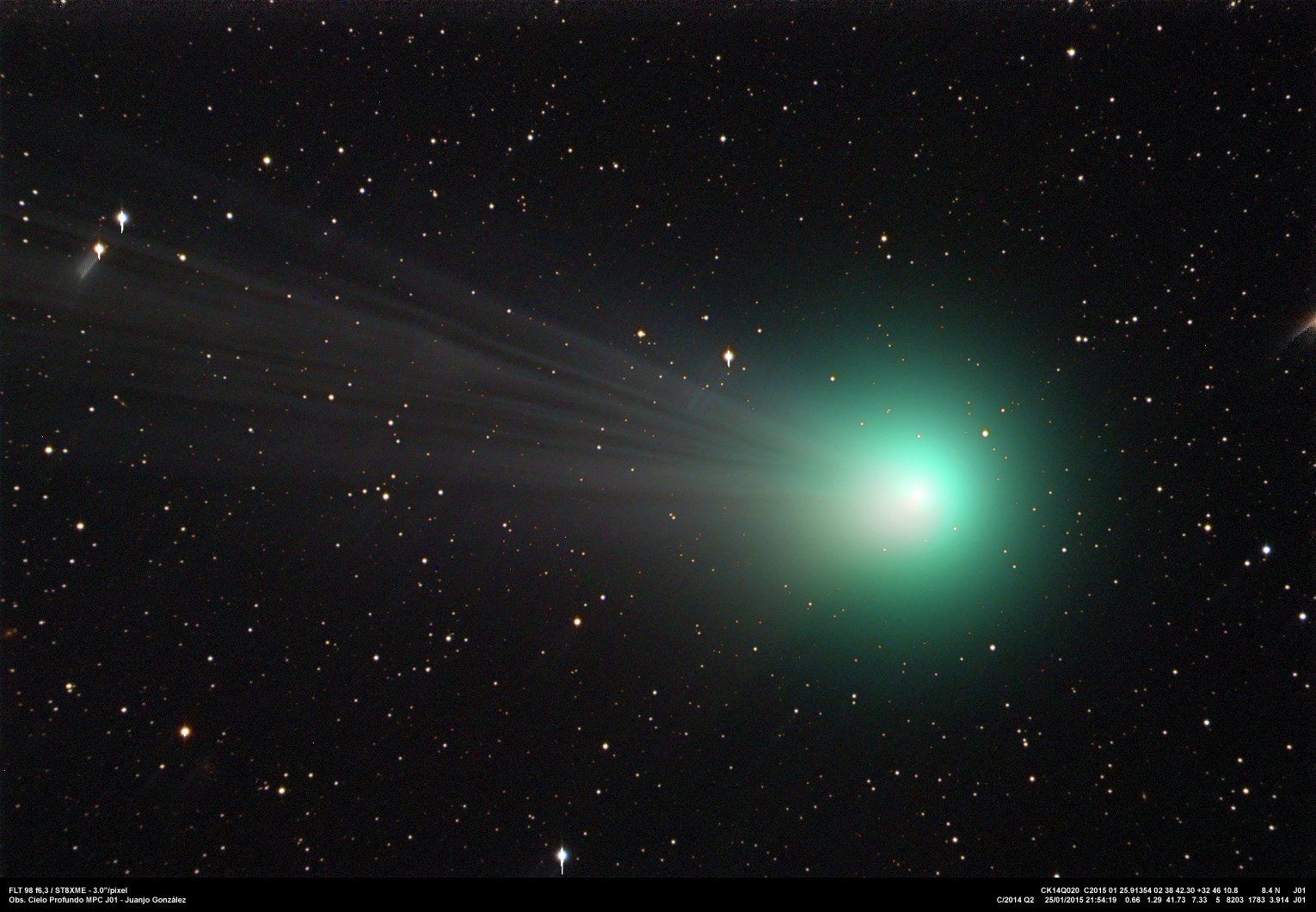 Cometa C/2014 Q2 Lovejoy 28 enero 2015 • Juanjo Gonzalez Dos imágenes en color LRGB del Lovejoy tomadas el pasado domingo. Una es una toma simple de 180″ en L + 90″ en RGB. La otra es un apilado de 32 tomas de 120″ para L con la información de color de la primera foto. Me gusta Cargando... Relacionado