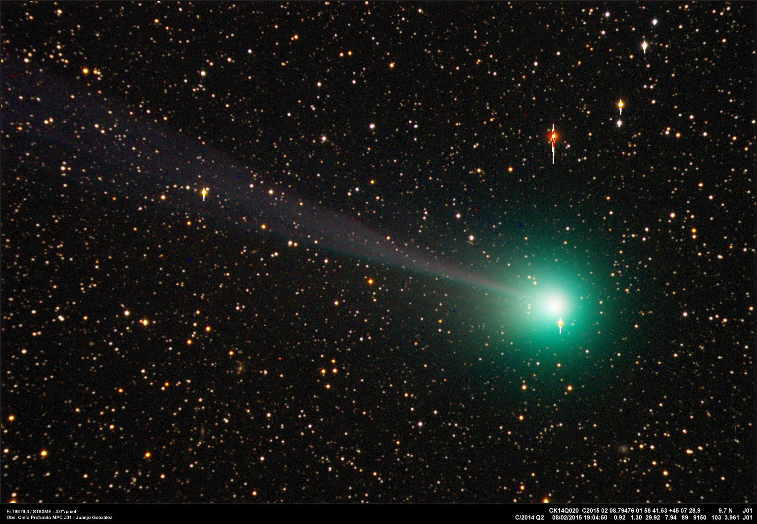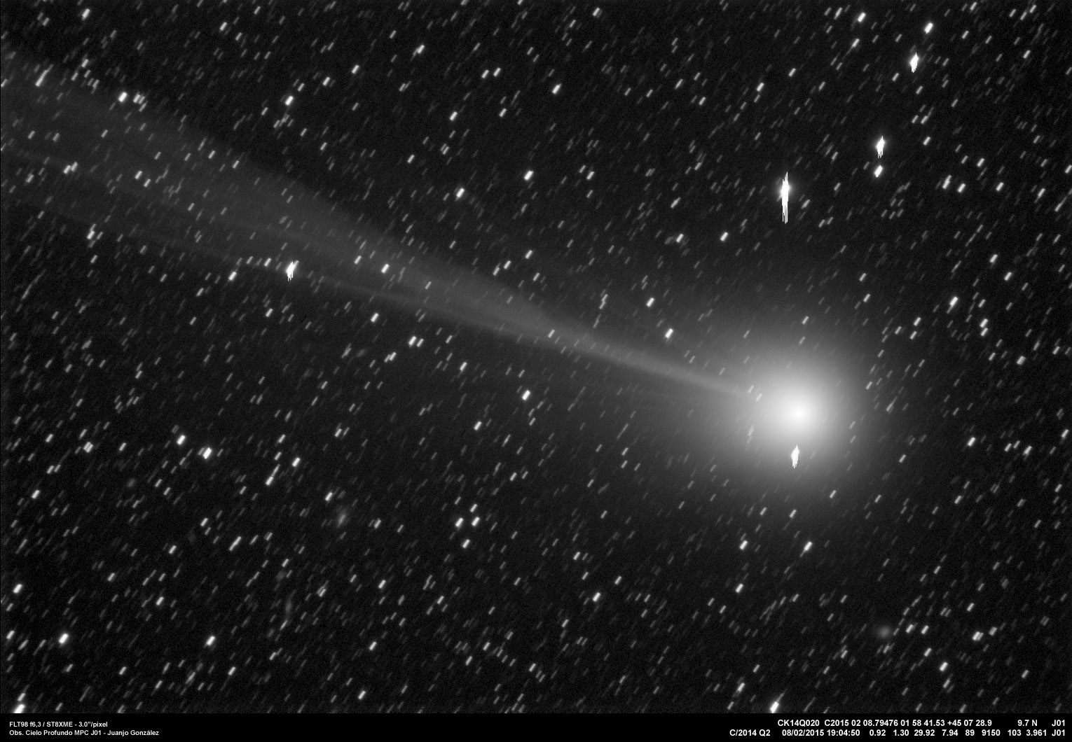 Tras la luna llena, continuamos con las observaciones del cometa Lovejoy tras pasar por el perihelio hace unos días. A perdido una magnitud desde el momento de su máximo brillo, pero su aspecto sigue siendo espectacular. En estos momentos se encuentra a unos 140 millones de km. de distancia de la Tierra.