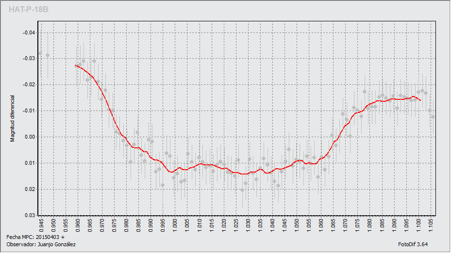 Observación del tránsito del exoplaneta HAP-P-18 b, situado en la constelación de Hercules. El sistema planetario se encuentra a más de 500 años luz de distancia, El planeta tiene un tamaño parecido a Júpiter, y completa una órbita en sólo 5.5 días terrestres.