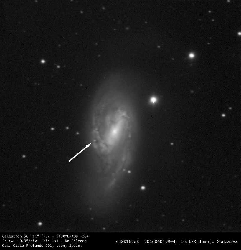 Supernova sn2016cok en M66 5 junio 20165 junio 2016 • Juanjo Gonzalez Imagen de la Supernova sn2016cok, descubierta hace unos días en la galaxia M66 del conocido triplete de Leo. La galaxia está situada a unos 36 millones de años luz de distancia. Comparte esto: Haz clic para compartir en Facebook (Se abre en una ventana nueva) Facebook Haz clic para compartir en X (Se abre en una ventana nueva) X Me gusta Cargando... Relacionado