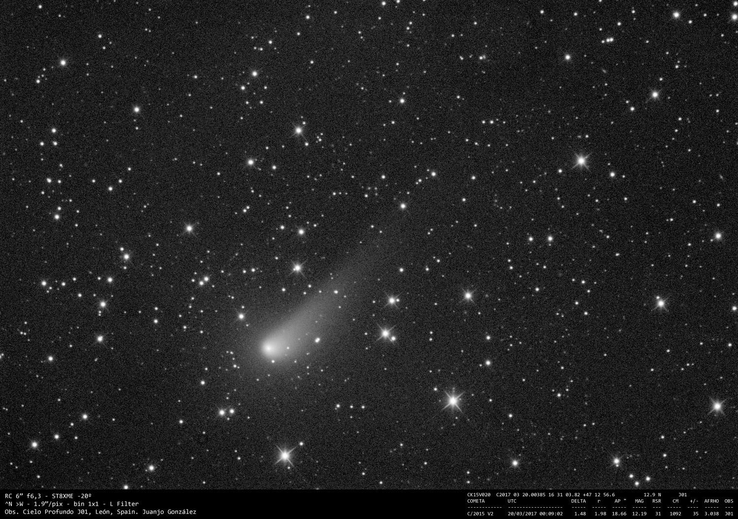 Cometas 41P y C/2015 V2 22 marzo 2017 • Juanjo Gonzalez Imágenes de los cometas 41P y C/2015 V2 obtenidas la noche del 19 al 20 de Marzo. De momento no hay novedades en cuanto a un posible estallido de actividad del 41P al acercarse al perihelio. Comparte esto: Haz clic para compartir en Facebook (Se abre en una ventana nueva) Facebook Haz clic para compartir en X (Se abre en una ventana nueva) X Me gusta Cargando... Relacionado
