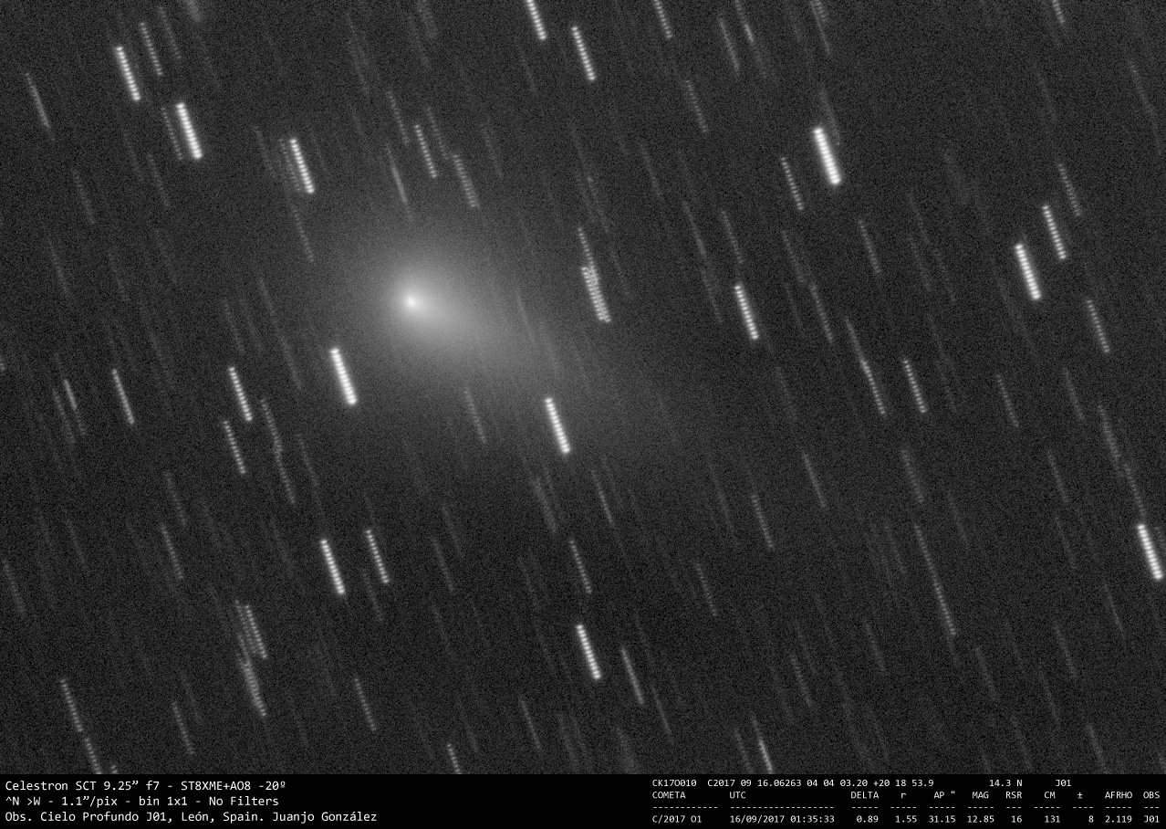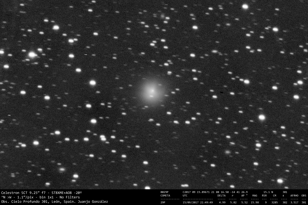 Imágenes de los cometas 29P, presentando una coma the al menos 3′ de diámetro fruto de los estallidos de actividad de las últimas semanas, y del cometa C/2017 O1, que continua con su previsible aumento de actividad al acercarse al perihelio, previsto para el día 14 de Octubre.