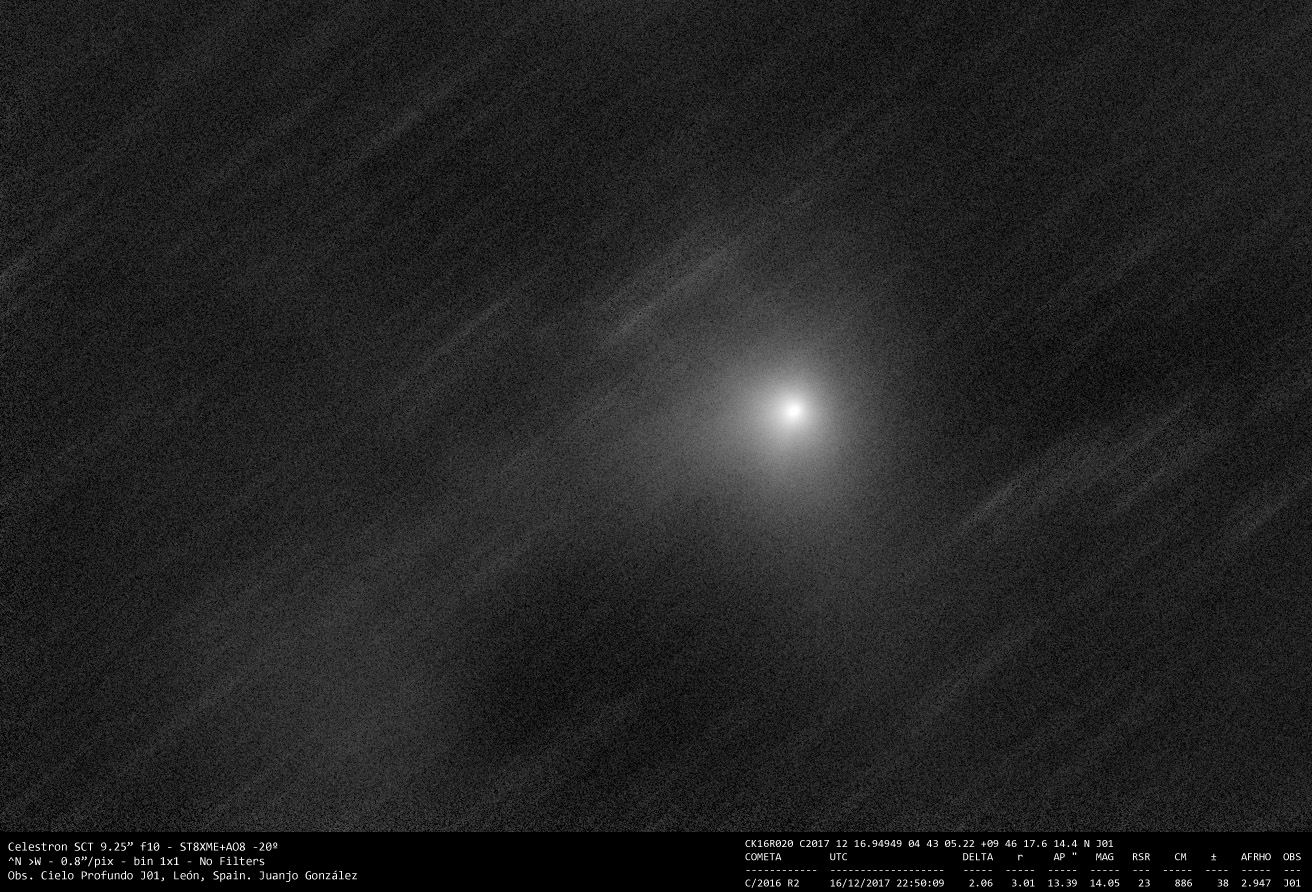 Cometa C/2016 R2 19 diciembre 201719 diciembre 2017 • Juanjo Gonzalez Una nueva imagen de este interesante cometa, que cada día presenta una actividad más extraña, con cambios continuos en la morfología de la cola y la coma. Comparte esto: Haz clic para compartir en Facebook (Se abre en una ventana nueva) Facebook Haz clic para compartir en X (Se abre en una ventana nueva) X Me gusta Cargando... Relacionado