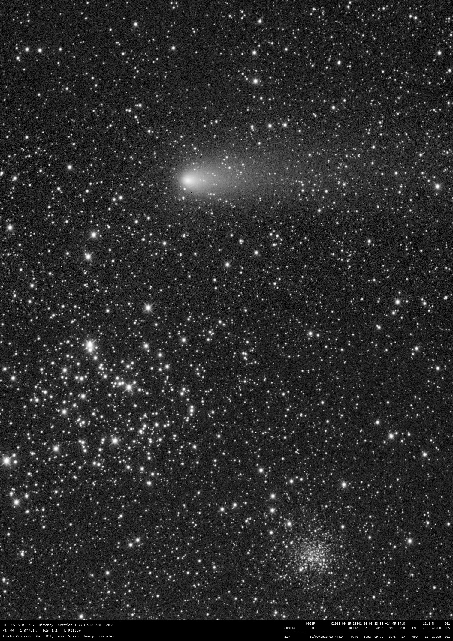 Cometa 21P 15 septiembre 2018 • Juanjo Gonzalez Imagen del cometa 21P en las cercanías de M35 y NGC 2158, la pasada madrugada del día 15 de Septiembre Comparte esto: Comparte en Facebook (Se abre en una ventana nueva) Facebook Compartir en X (Se abre en una ventana nueva) X Me gusta Cargando... Relacionado