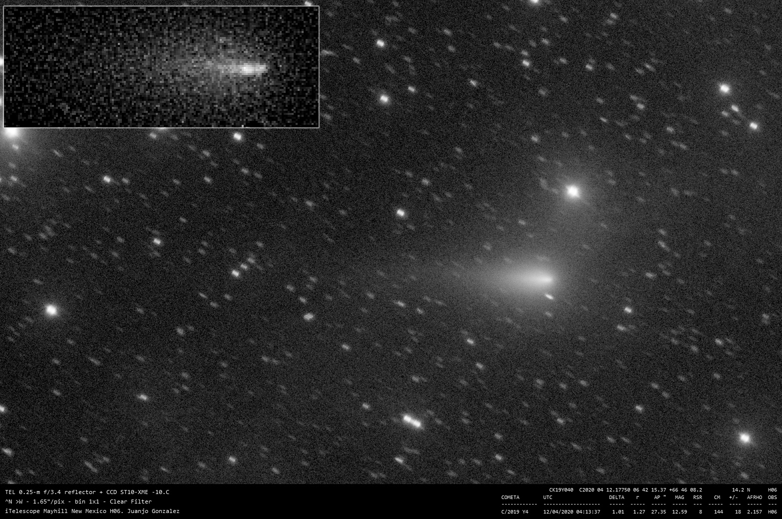 Cometa C/2019 Y4 12 abril 2020 • Juanjo Gonzalez Esta es la imagen que he podido obtener hace sólo unas horas desde H06 New Mexico, incluyendo un procesado para intentar apreciar el tren de escombros. La resolución de la captura no de para más, pero se aprecia la fragmentación sin problemas. Comparte esto: Comparte en Facebook (Se abre en una ventana nueva) Facebook Compartir en X (Se abre en una ventana nueva) X Me gusta Cargando... Relacionado