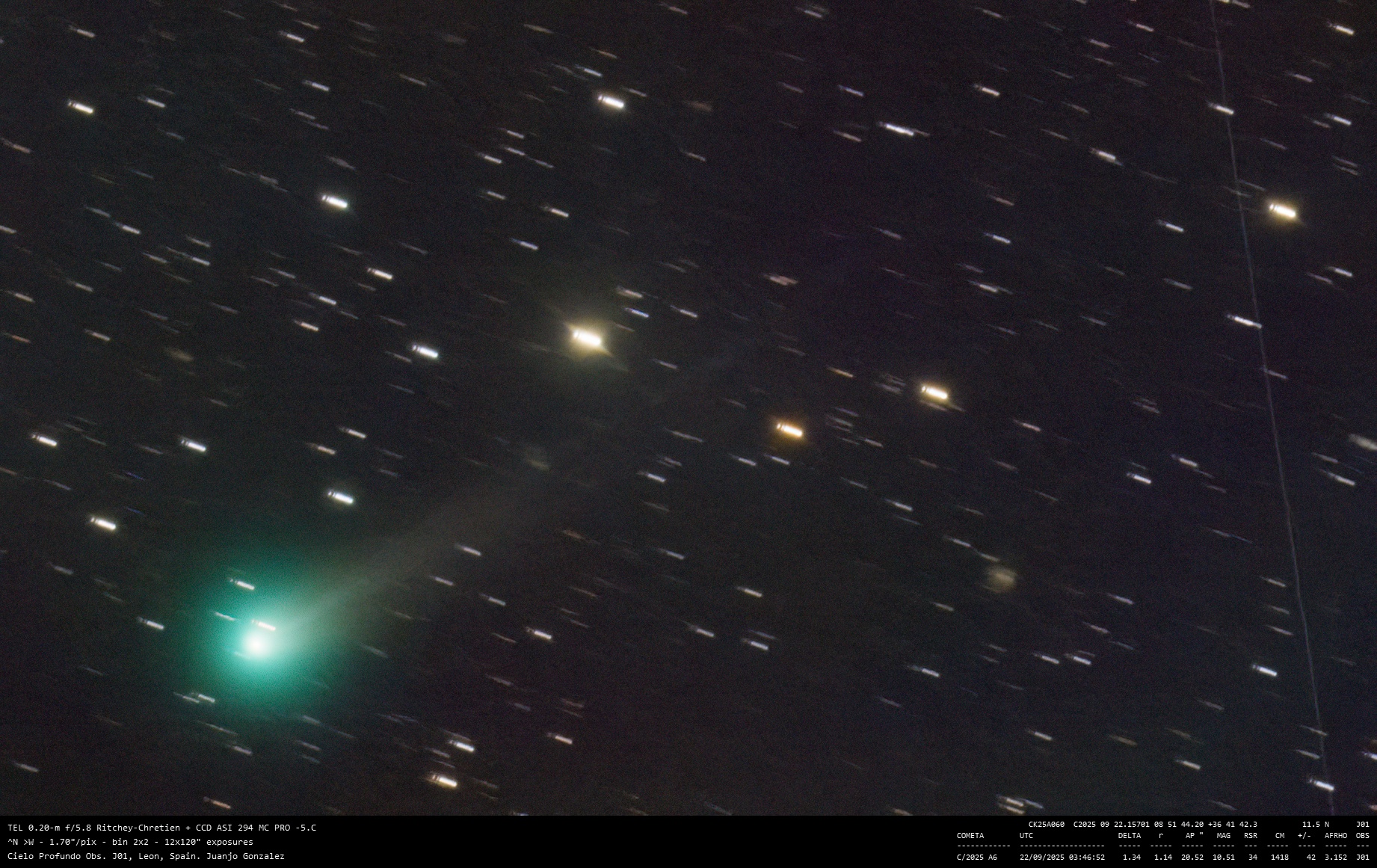 Cometa C/2025 A6 Imagen • 22 septiembre 2025 • Juanjo Gonzalez Comparte esto: Comparte en Facebook (Se abre en una ventana nueva) Facebook Compartir en X (Se abre en una ventana nueva) X Me gusta Cargando... Relacionado