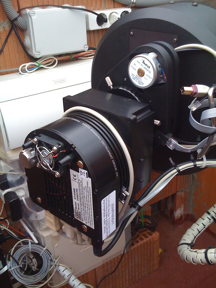 Esta es la configuración actual del equipo del observatorio, con un Celestron C9.25 de fibra de carbono, un enfocador FLI-DF2 y una cámara ST-8XME equipada con óptica adaptativa AO8.