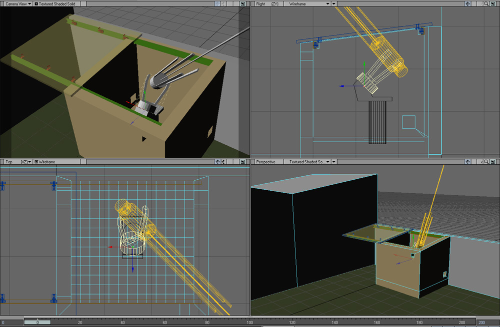 De momento el diseño está solo sobre el tablero, aunque ya he creado unos modelos tridimensionales para estudiar la instalación de los equipos, la visibilidad que puedo conseguir y el tamaño que puede tener la instalación. La idea es hacer un observatorio de reducidas dimensiones y techo deslizante, con una ligera pendiente hacia el sur para conseguir más visibilidad. El hueco interior calculado es de 1.30 x 1.30 y 1.50 de altura libre. En principio parece suficiente para un telescopio de horquilla de 8 o 10″ o una montura ecuatorial de dimensiones medias con un tubo de 8 pulgadas. Como se puede ver, la idea es que en ningún caso el telescopio emerga sobre la cota de la cubierta deslizante, para permitir cerrarla en cualquier situacion, incluso aunque no sea posible mover el telescopio.